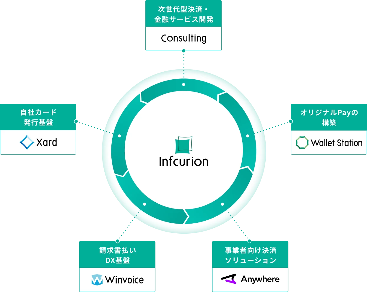インフキュリオンは、キャッシュレス決済や企業間決済、金融機関・公共を支える基盤まで、あらゆる決済・金融サービスを実現する次世代型決済インフラを提供。金融・決済領域の豊富なコンサルティング実績と知見をもとに、事業の革新から新規事業の創出まで包括的に支援しています。